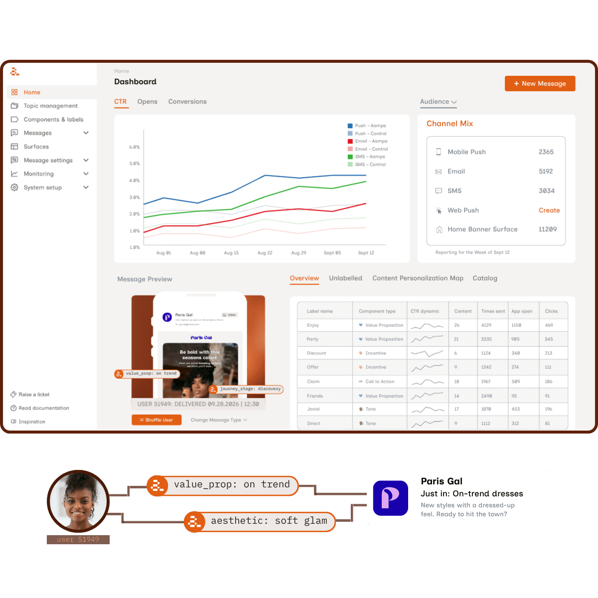 Work with Aampe to map your content strategy, define your labels — like value proposition, tone, and offer — and create the semantic learning vocabulary agents will use across messages.