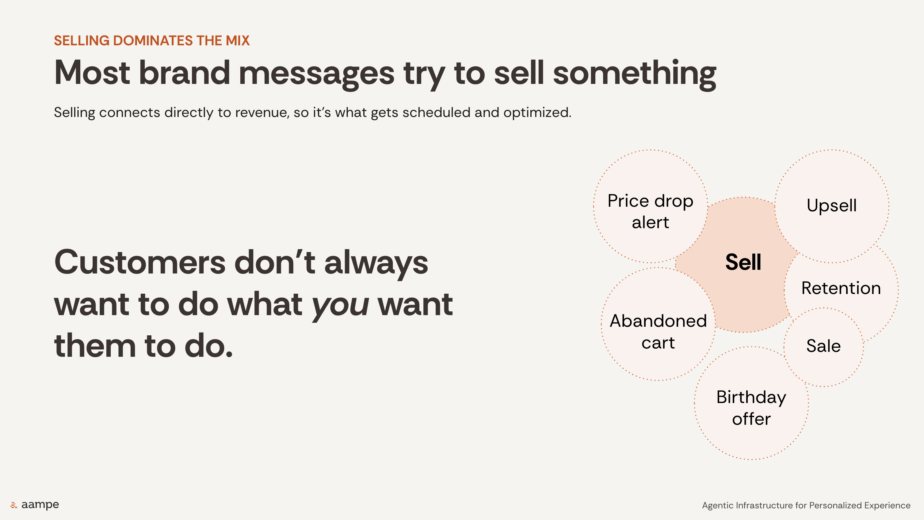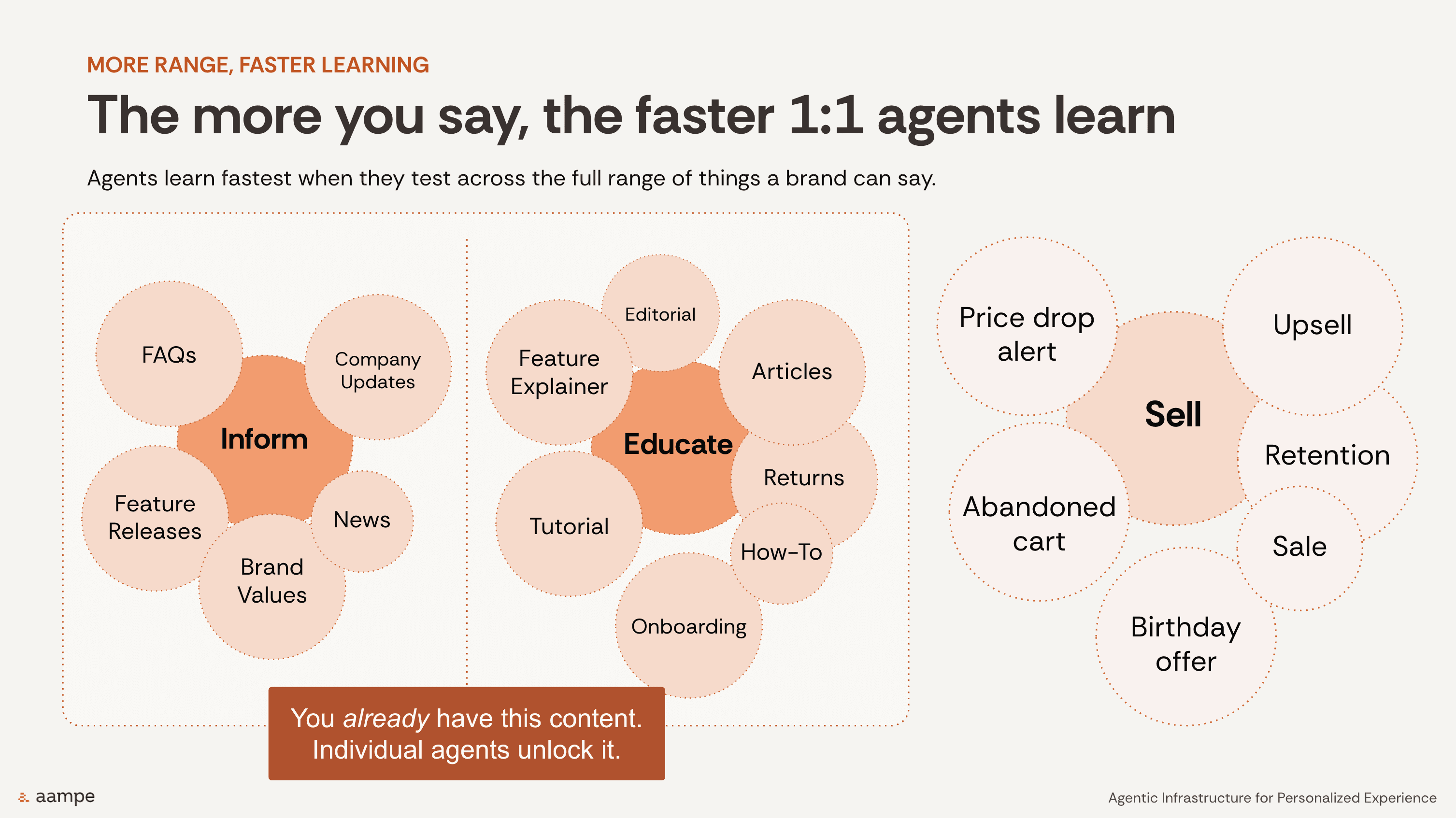 Aampe's session highlighted that agents learn faster when they can test across the full spectrum of what a brand can say — not just commercial offers, but editorial content, educational content, tutorials, onboarding, feature explainers, FAQs, updates, and values-driven content as well.