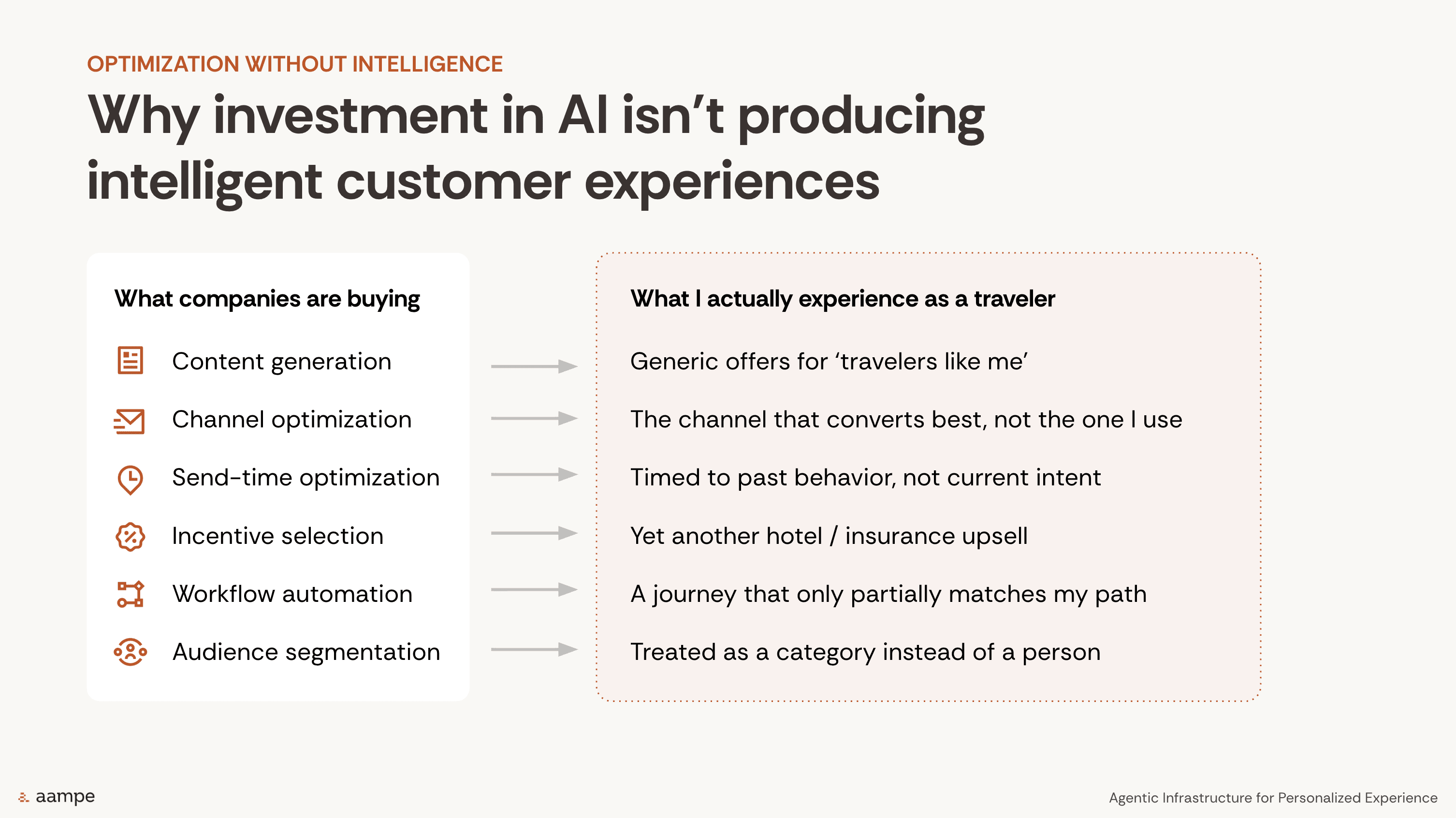 This is one of the central limitations of campaign-scoped AI: it serves the operating model of the business, not the evolving reality of the traveler. A business may see optimization. The traveler experiences repetition.