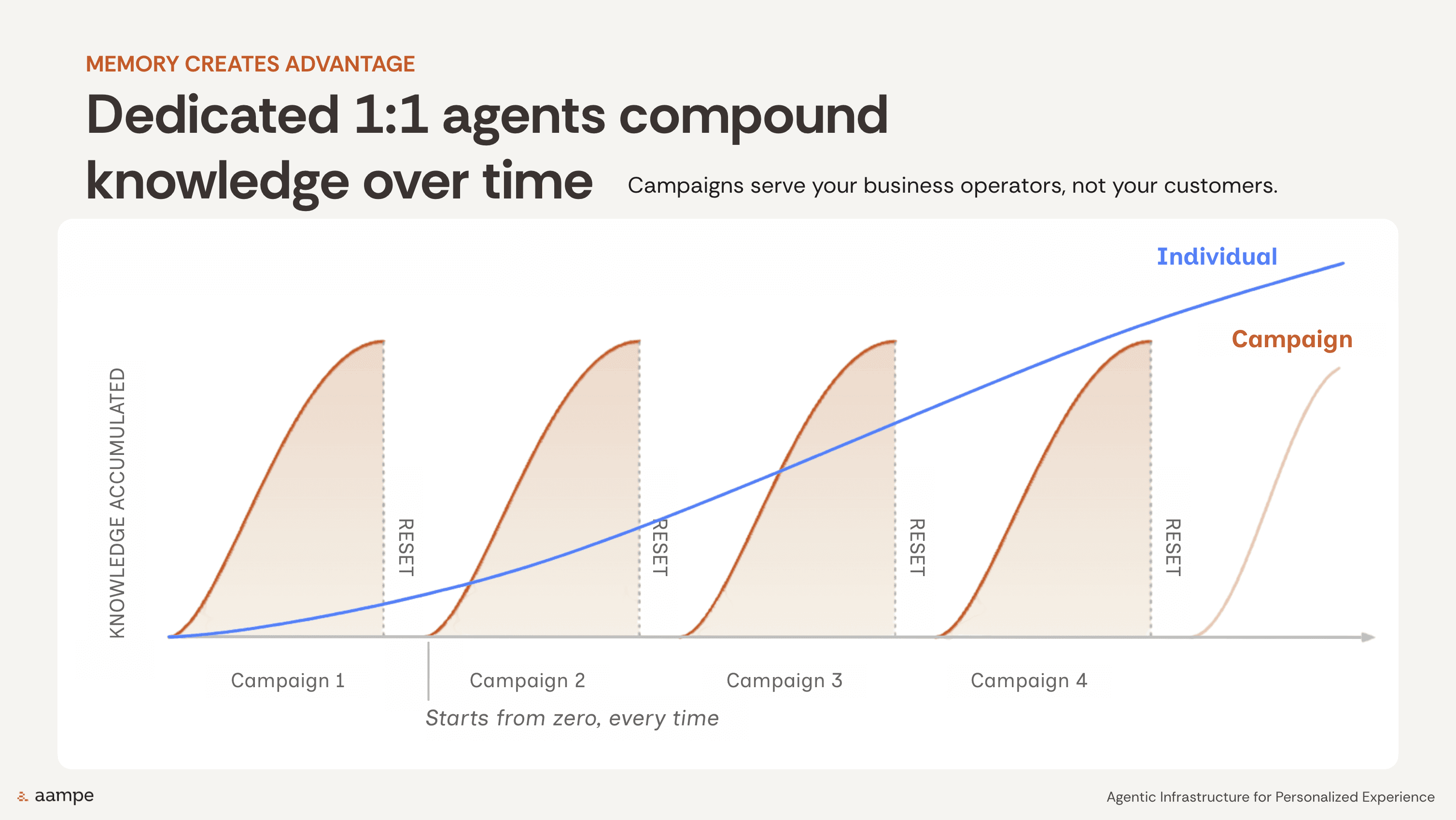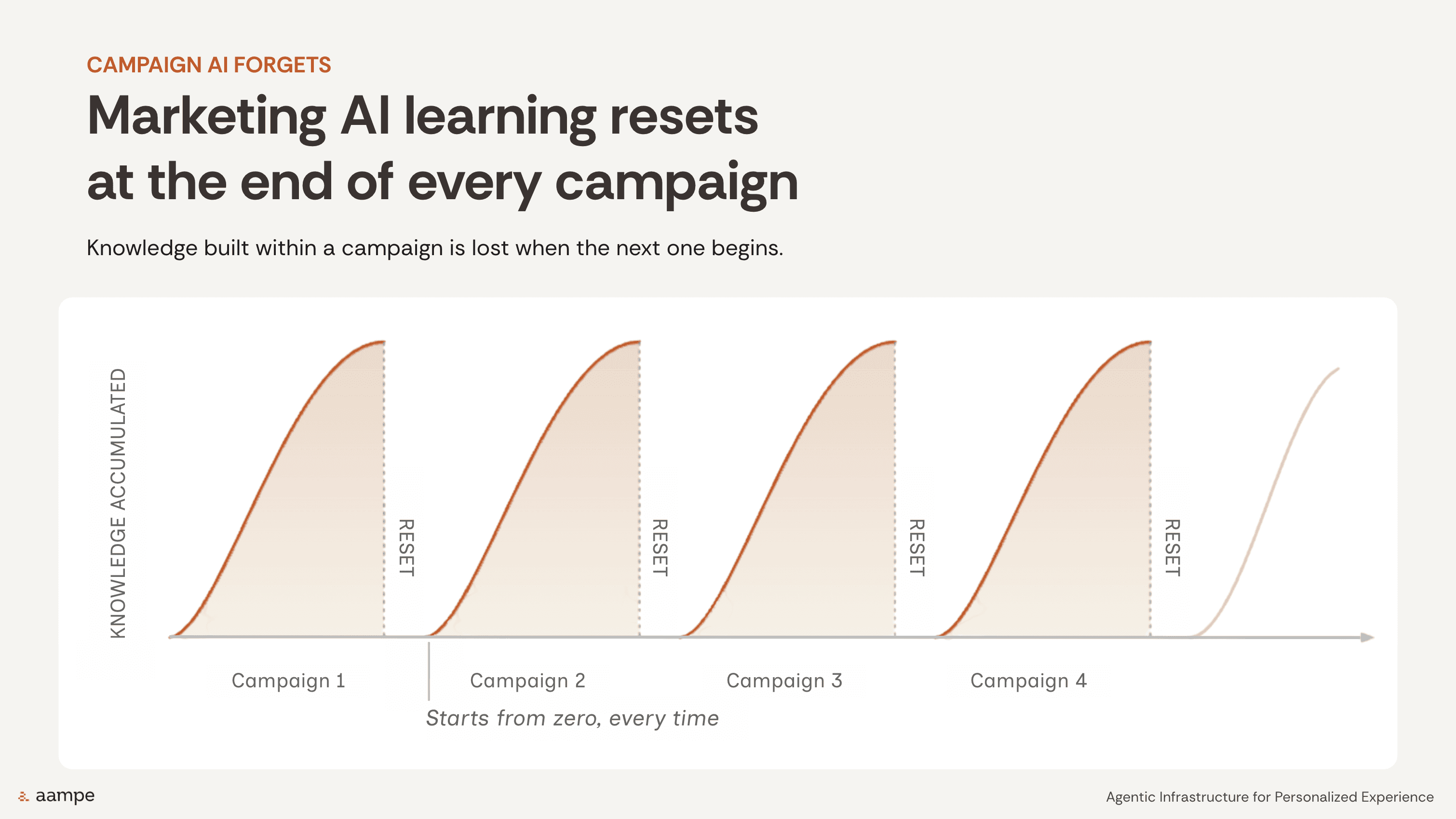 That means the system may improve within one workflow, but when the next campaign starts, the learning effectively resets. Aampe's session visualized this as repeated campaign curves that build knowledge, then drop back to zero, over and over again.