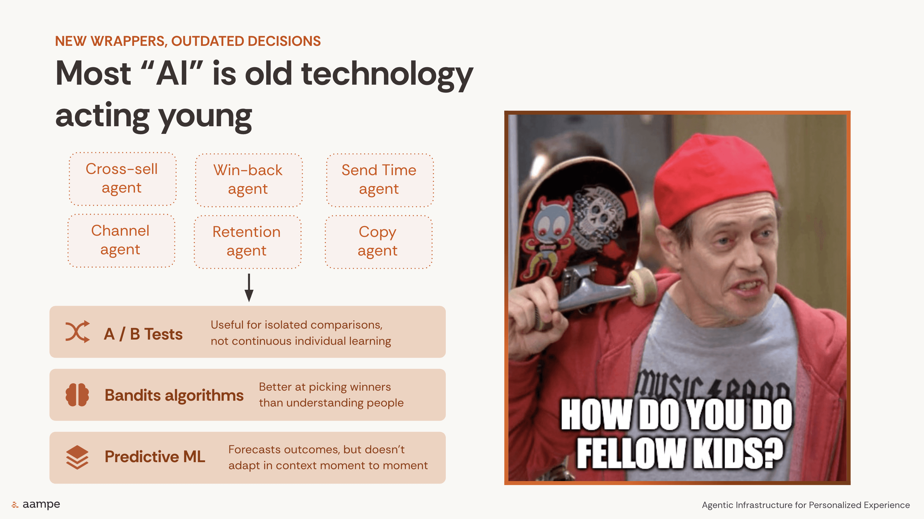The interfaces may look modern. The components may now include copy agents, channel agents, send-time agents, and cross-sell agents. But the decisioning layer underneath often still depends on familiar tools: A/B tests, bandits, and predictive ML. In isolation, each of those methods has value. But none of them were designed to support continuous, individual-level intelligence. As the deck puts it: most “AI” is still “old technology acting young.”