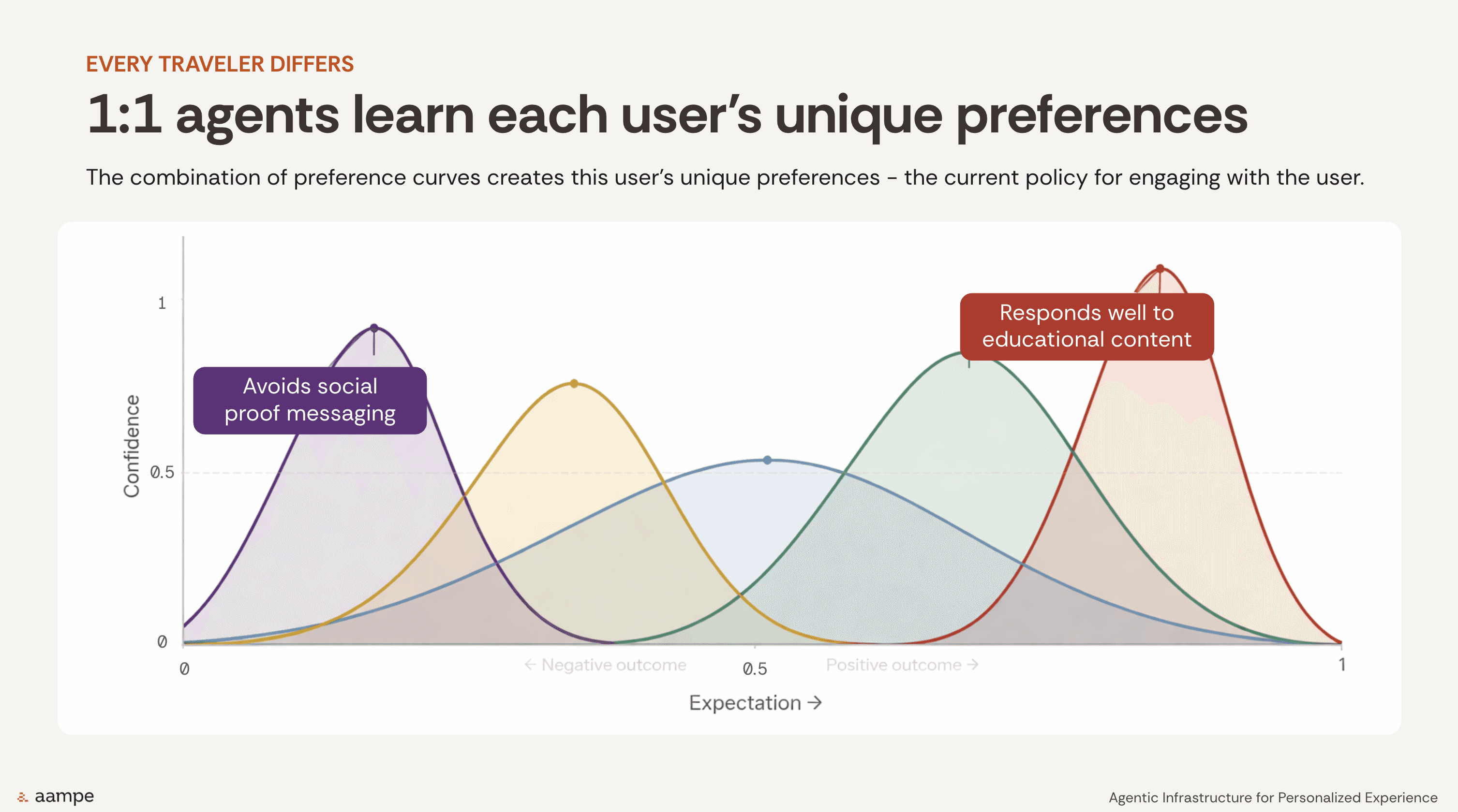Aampe visualized this as a combination of overlapping preference curves, creating a traveler-specific pattern: one person may avoid social proof, another may respond to educational content, and another may show different preferences entirely. Together, those curves form the current policy for how to engage that individual.