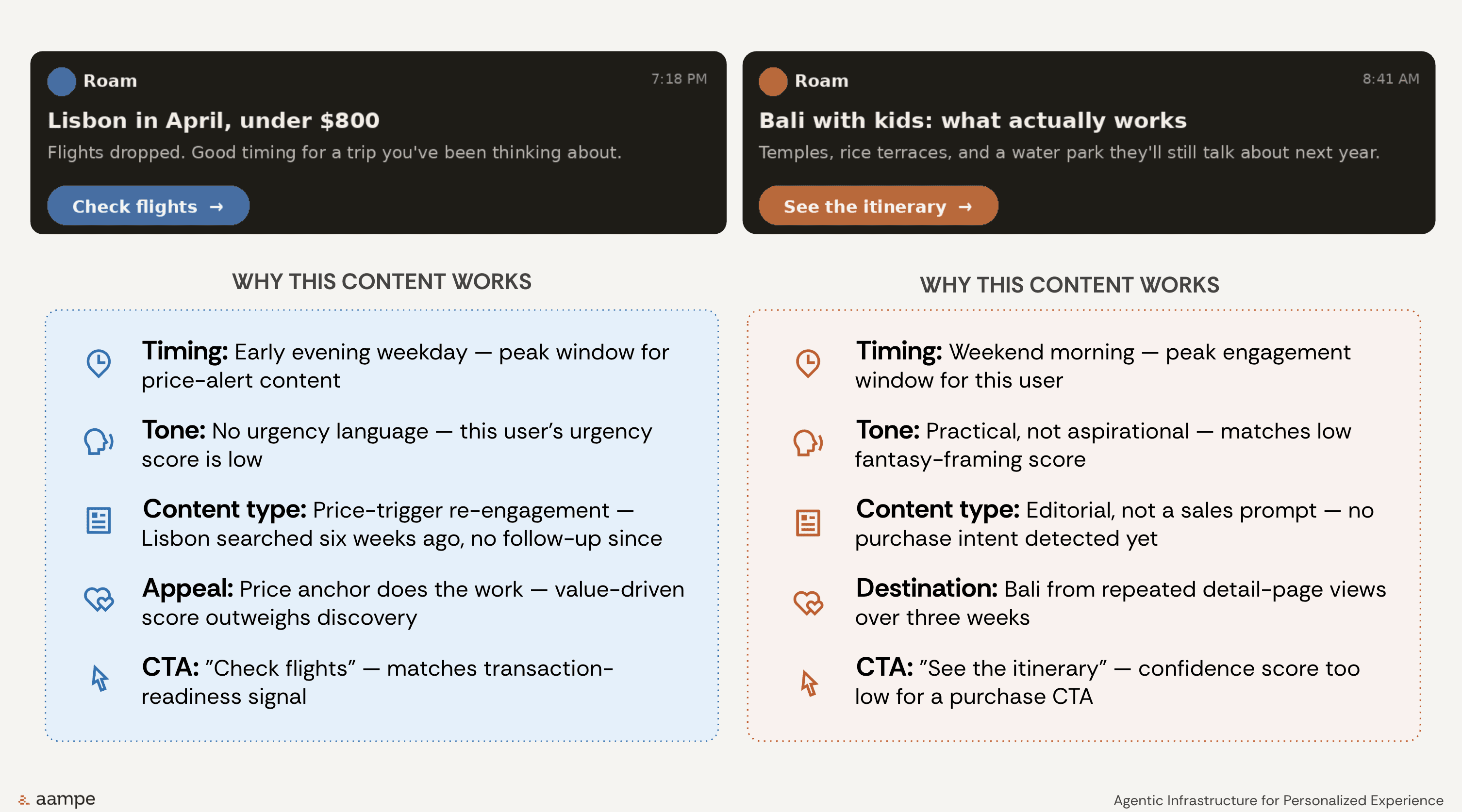 One example surfaced a Bali itinerary message for a user whose behavior suggested editorial, practical planning content would resonate. Another surfaced a Lisbon fare message for a traveler whose signals pointed to price-driven re-engagement. The reasoning behind those messages differed across timing, tone, content type, destination, appeal, and CTA.