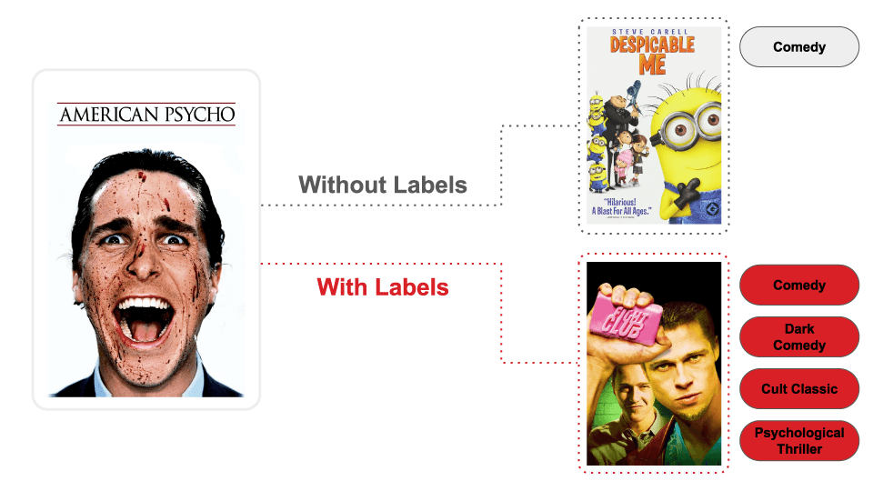 With those labels in place, the recommendation shifts from Despicable Me to Fight Club, not because the movies are identical, but because they share the more nuanced underlying themes that actually drove the original choice.
