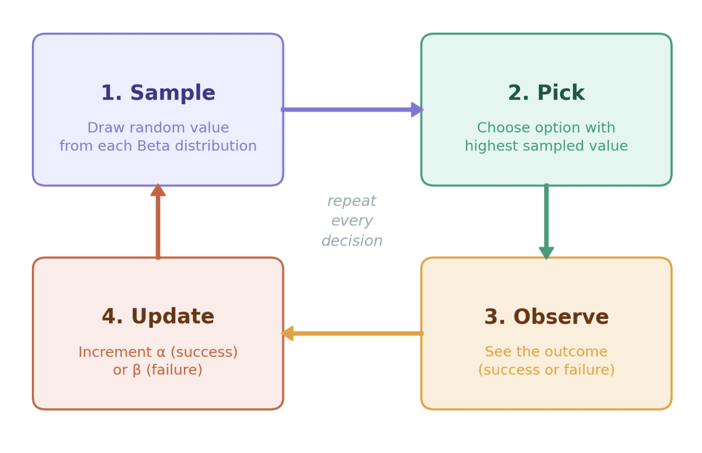 The magic is in the sampling. An option you're uncertain about has a wide distribution. Sometimes its random sample will be high, sometimes low. So it gets explored occasionally. An option you're confident about and that performs well has a narrow, high distribution. Its samples are consistently high. So it gets exploited reliably. An option you know is bad? Narrow and low. It gets ignored.