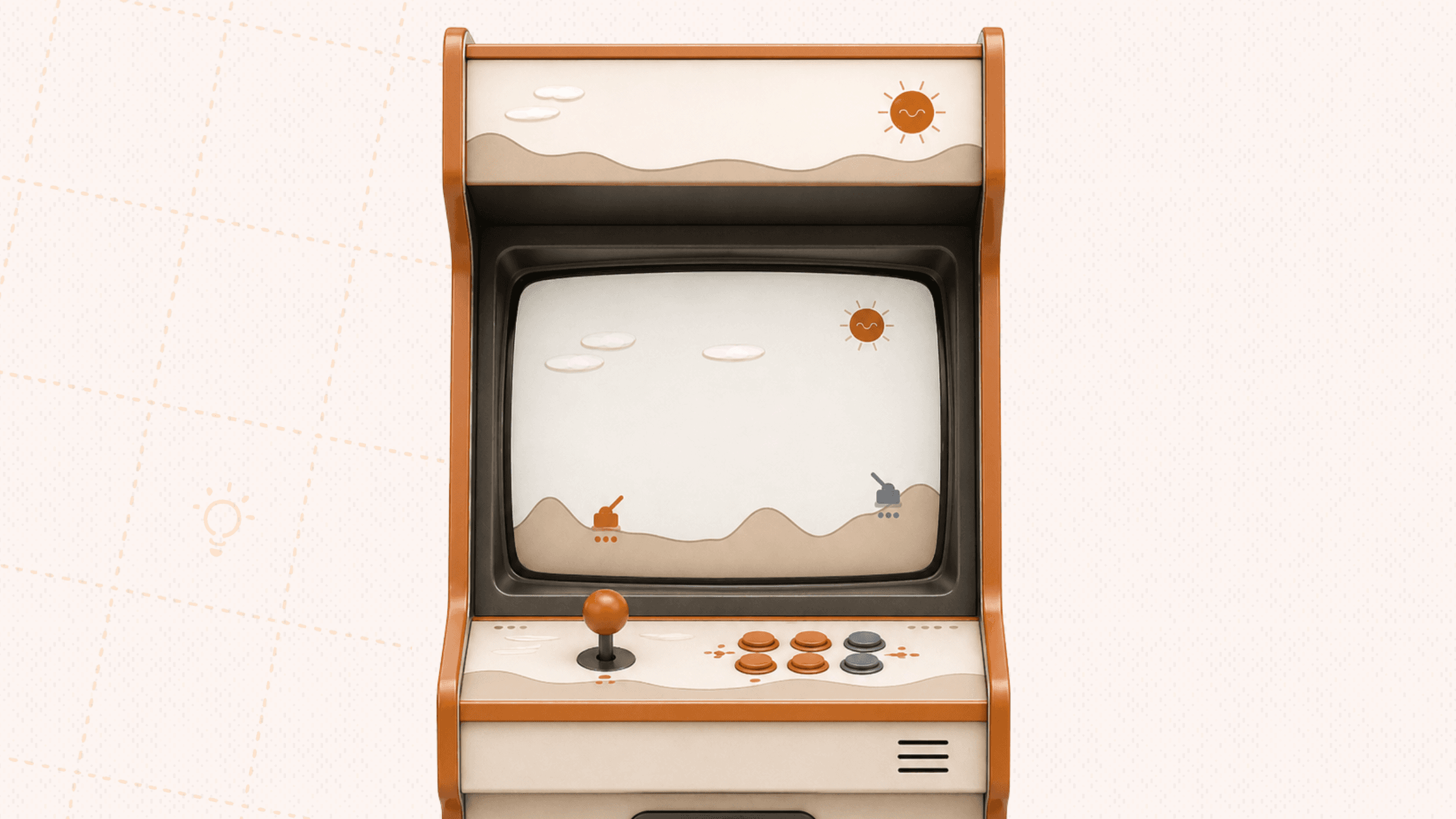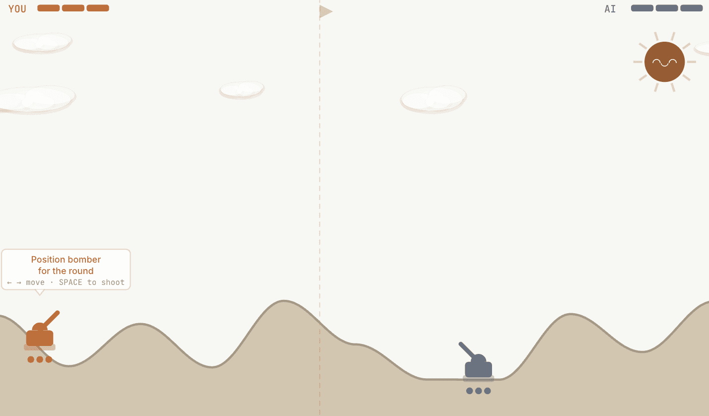 The controls are simple. Arrow keys to move your tank, spacebar to fire. The AI fires back using Thompson Sampling to decide how much power to put behind each shot. Watch the belief chart on the right. Each bar shows the AI's current best guess of how often that power level wins (the posterior mean). Tall = "I think this works." Short = "I don't think this works." The opacity of the bar shows confidence: faded means the AI hasn't tried it much, solid means it has lots of evidence. The yellow bar is the option the AI just picked.