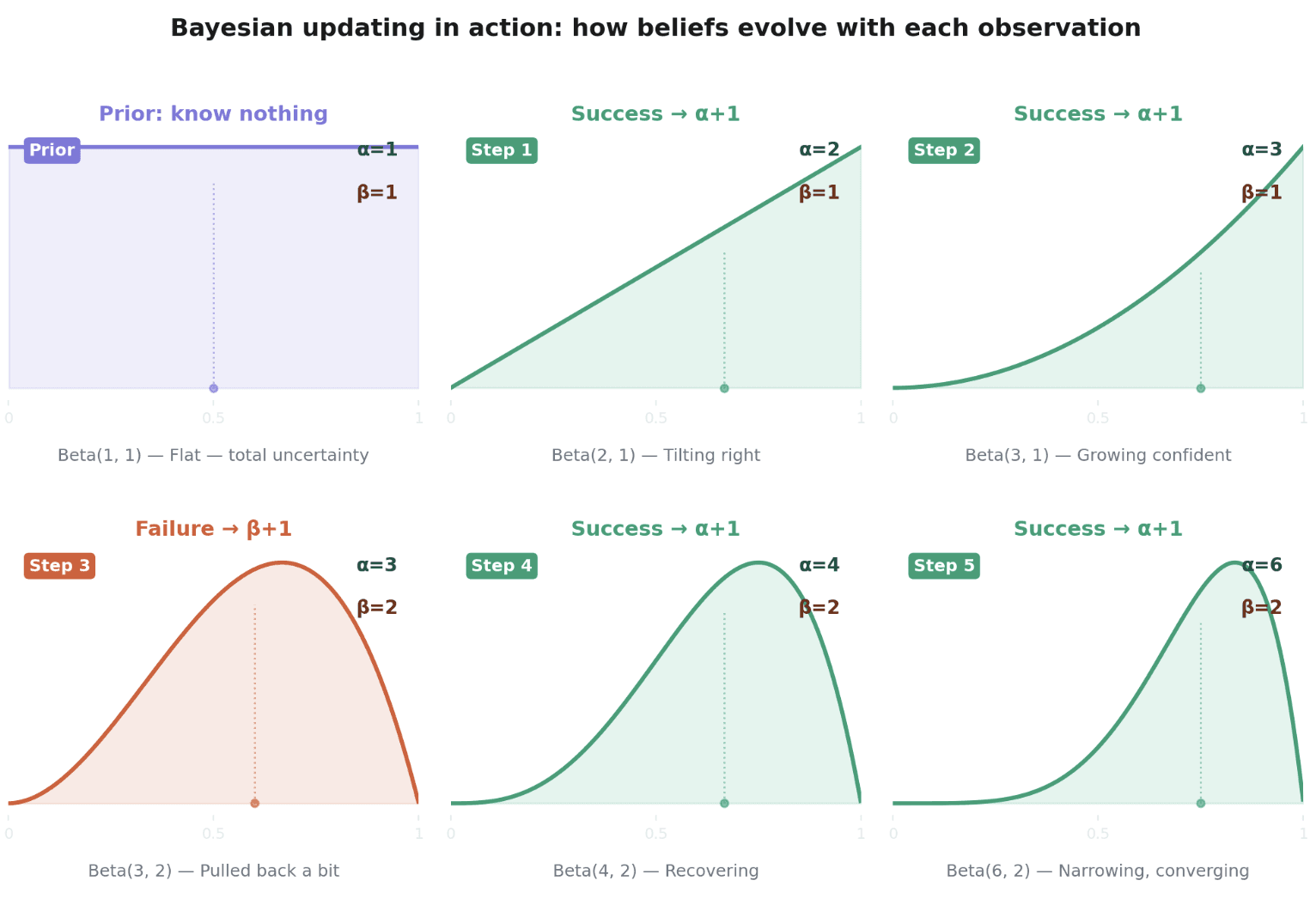 The intuition is Bayesian at its core. You start with a prior belief (uniform: "I don't know anything"), observe evidence, and update your belief. The Beta distribution is a natural fit here because it's conjugate to the Bernoulli likelihood. That means every success/failure observation gives you a clean, closed-form posterior update. No expensive retraining. No batch jobs. Just increment alpha or beta and sample again. With a Beta-Bernoulli setup like this, the per-decision cost is essentially zero. Scaling Thompson Sampling to richer models (e.g. neural networks producing posterior distributions over P(click | context, ad)) is an active research area. The algorithm itself stays cheap; computing the full posterior is what gets expensive.