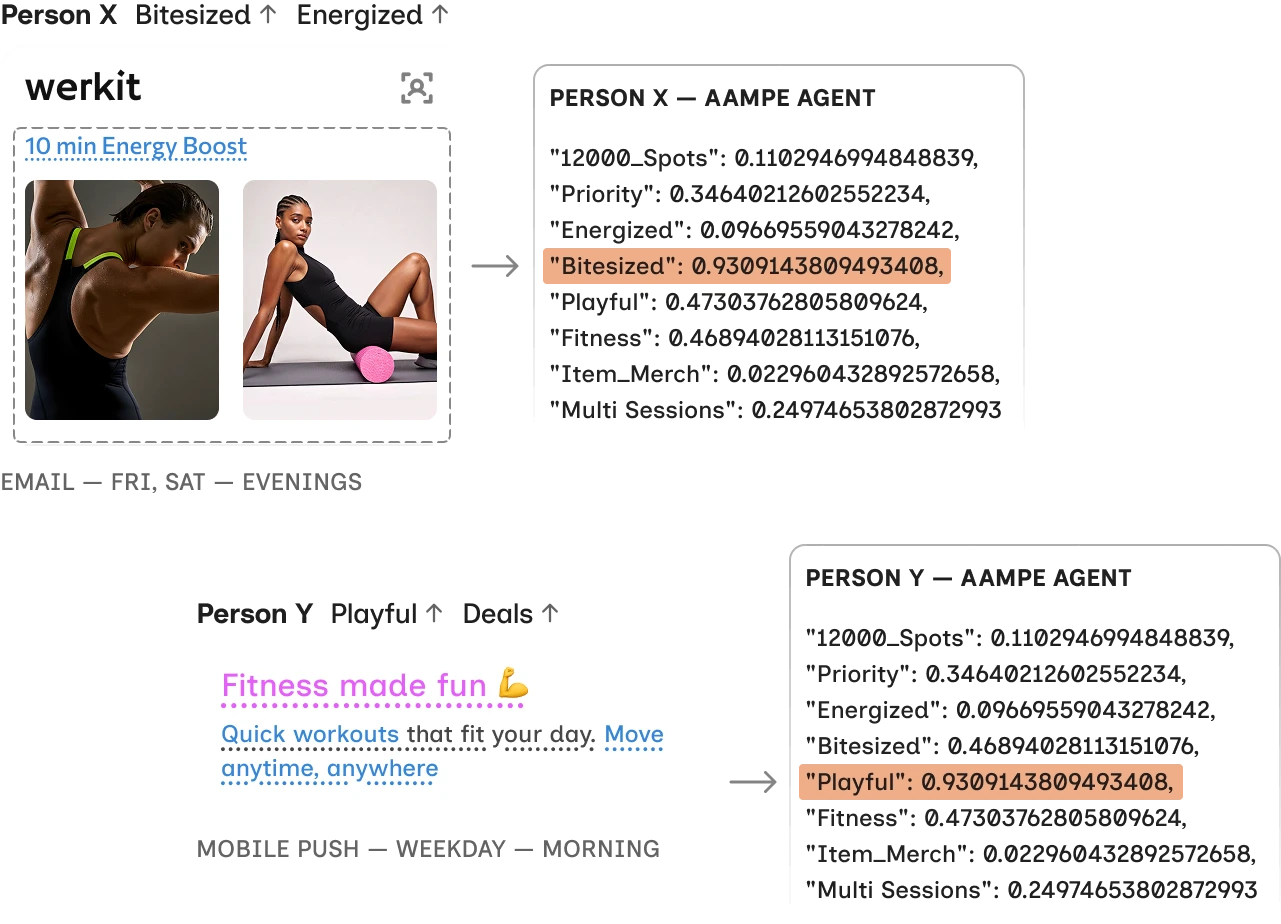Teams define abstract concepts, and Aampe agents automatically populate those dimensions with user-specific data. The result is a living, high-resolution feature space that updates in real time for downstream models.